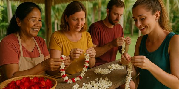 Each week offers a different local craft experience guided by friendly barangay artisans — from bamboo weaving and coconut-shell carving to shell and sand art, palm-fan making, bracelet crafting with community kids, and even banana-leaf cooking or flower-lei making.
